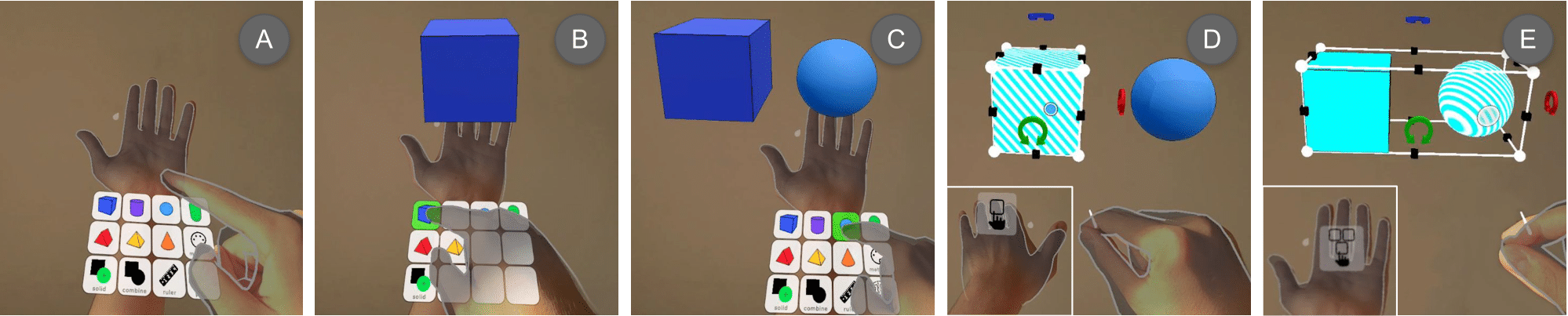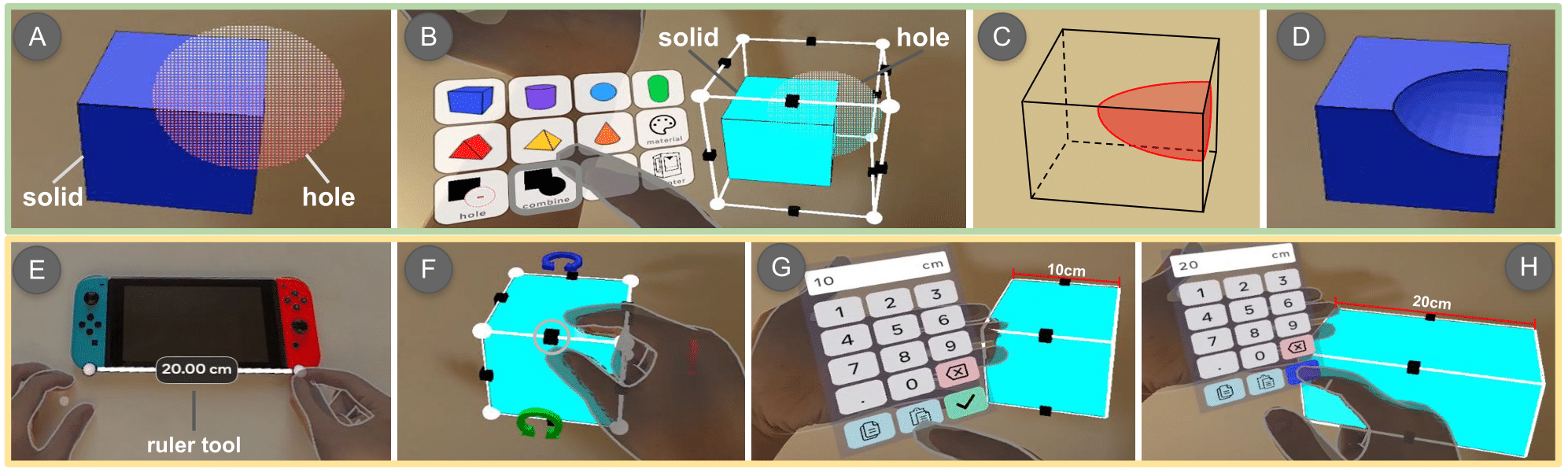 Intuitive object creation using hand gestures and Constructive Solid Geometry (CSG) primitives for building complex 3D models in AR space.