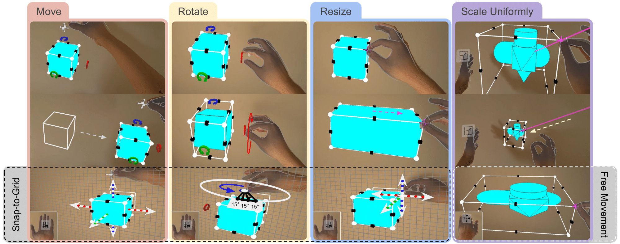 Comprehensive interaction framework for manipulating 3D objects including translation, rotation, scaling, and Boolean operations in augmented reality.