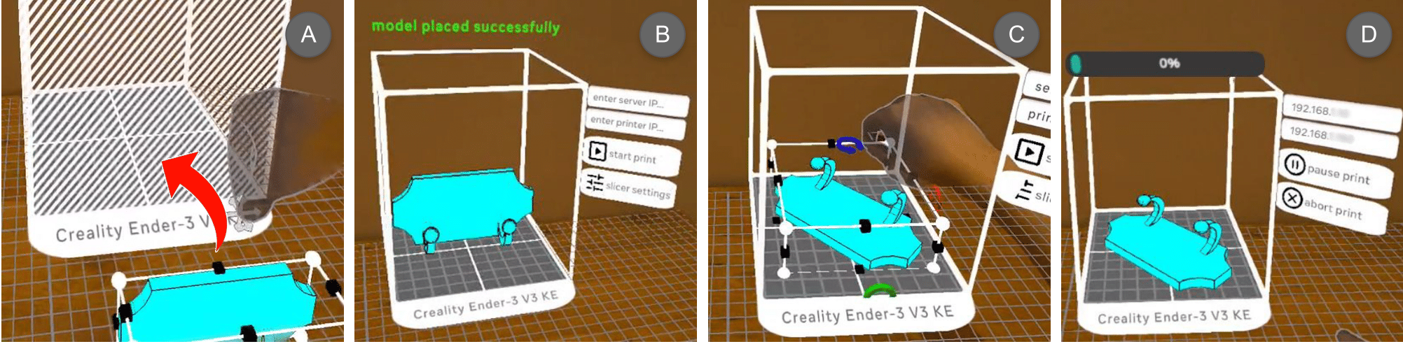 TinkerXR integrates design with fabrication through a drag-and-drop interface for 3D printer virtual twins. The system includes built-in slicing capabilities and allows users to initiate printing directly from the AR interface, enabling the transition from digital design to physical creation.