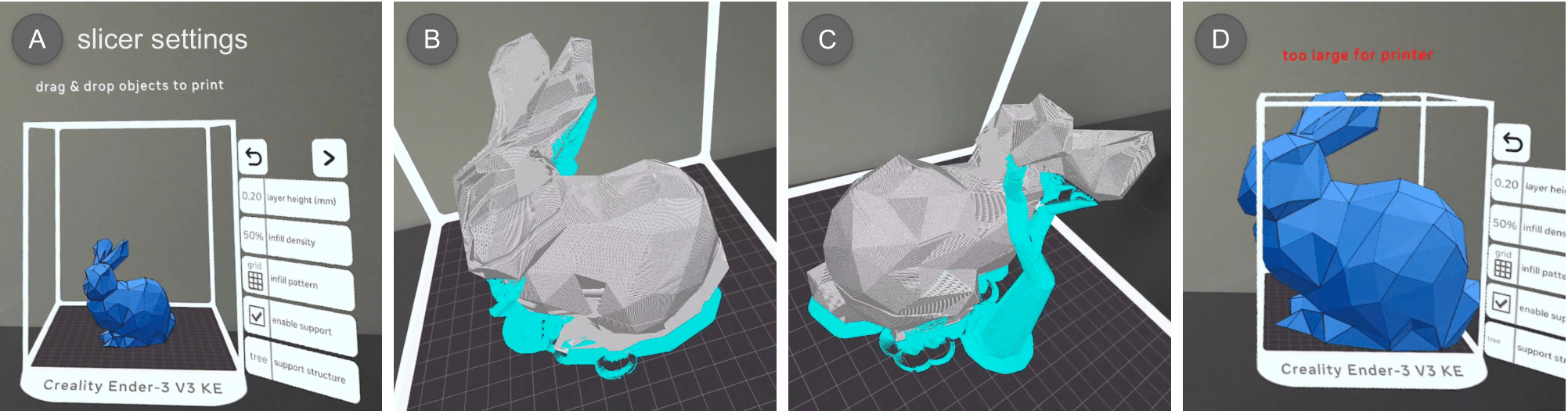 Built-in slicing functionality allows users to prepare models for 3D printing directly within the AR interface, simplifying the fabrication workflow.
